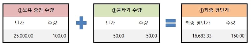 코인 물타기 계산은 간단하게 엑셀로도 산출이 가능합니다. 방법은 간단합니다. 보유중인 수량에 해당 암호화폐의 평균 단가와 수량을 입력 한 후 추가 물타기 할 수량과 현재 단가(시세)를 입력합니다. 그러면 자동저긍로 최종 평단가가 계산되는 방식입니다.